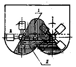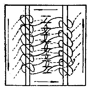该机由两个旋转方向的转子组成,转子上焊有多个特殊角度的桨叶,桨叶带动物料一方面沿着机槽内壁作逆时针旋转。一方面带动物料左右翻动,在两转子的交叉重叠区形成失重区,在此区域内,不论物料的行状、大小和密度如何都能使物料上浮处于失重状态,这使物料在机槽内形成全方位连续翻动、相互交错剪切,从而达到快速柔和、混合均匀的效果。见图2,图3。