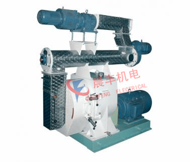 本机主它主要有喂料、搅拌、制粒、传动及润滑系统等组成。其工作过程是要求含水量不大于15%的配合粉料,从料斗进入喂料绞龙,通过调节无极调速电机转速,获得合适的物料流量,然后进入搅拌器,通过搅拌杆搅动与蒸汽混合进行调质,如果需要添加糖蜜和油脂,也从搅拌器加入与蒸汽一起进行调质(油脂添加量一般不超过3%,否则难于制粒),经过调质后配合粉料温度可达64~85℃,湿度可达14~16%。然后进入斜槽经过除铁装置除去混在配合粉料中的铁质,最后进入压制室进行制粒。